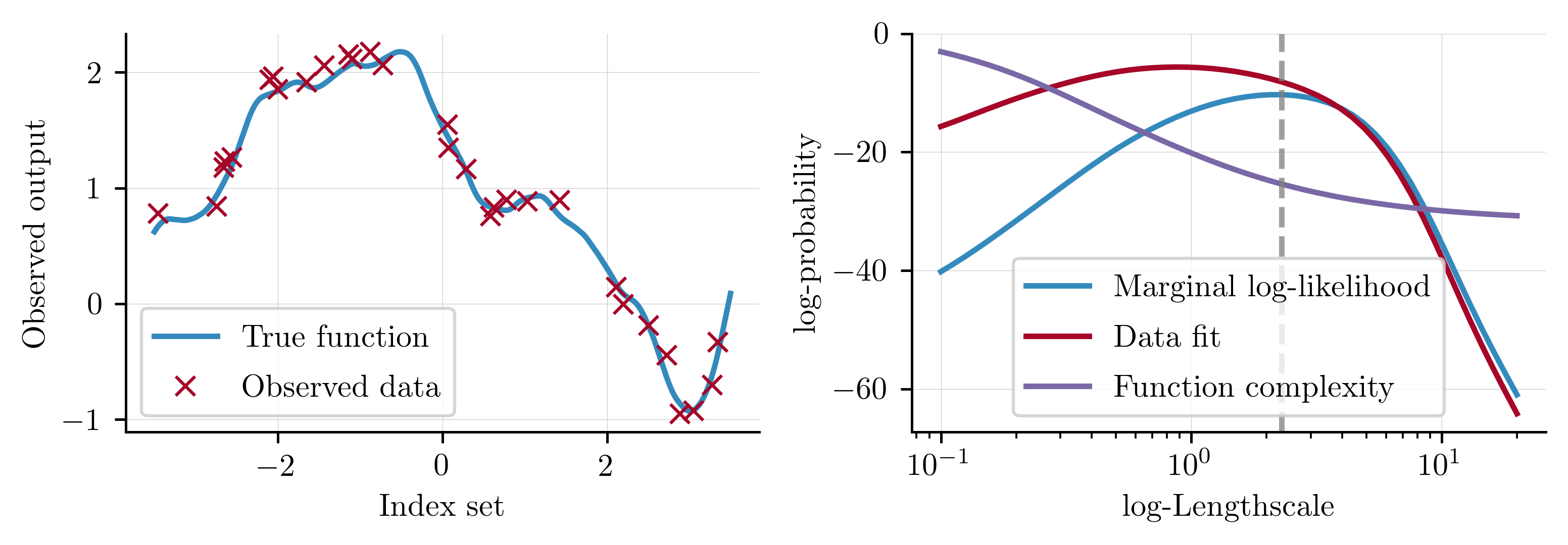 Observing the individual terms in the marginal log-likelihood can help understand exactly why optimising the marginal log-likelihood gives reasonable solutions. The data fit term is the only component of the marginal log-likelihood that includes the observed response \(\mathbf{y}\) and will therefore encourage solutions that model the data well. Conversely, the complexity term contains a determinant operator and therefore measures the volume of the function space covered by the GP. Whilst a more complex function has a better chance of modelling the observed data well, this is only true to a point and functions that are overly complex will overfit the data. Optimising with respect to the marginal log-likelihood balances these two objectives when identifying the optimal solution, as visualised below.