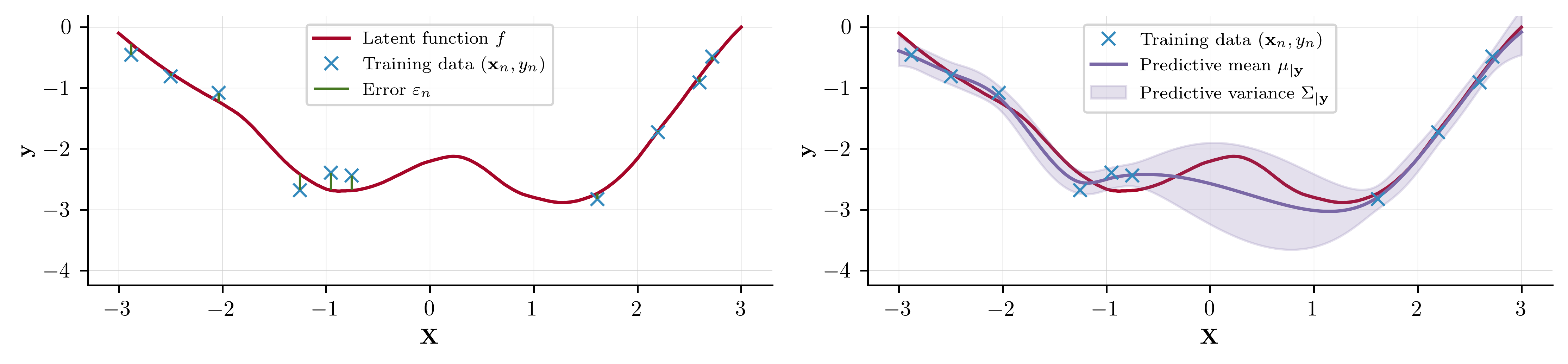 When the likelihood function is a Gaussian distribution \(p(y_i\,|\, f_i) = \mathcal{N}(y_i\,|\, f_i, \sigma_n^2)\), marginalising \(\mathbf{f}\) from the joint posterior to obtain the posterior predictive distribution is exact